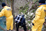 Opremili smo se i prvi tim je krenuo. Sačekao nas je malo neprijatan prizor. Da vrelo radi smo znali, ali smo se nadali da ćemo ipak proći "tobogan" što bi nam omogućilo dalje ronjenje u pećini. Medjutim za ono što smo videli nismo bili pripremljeni. Još letos negde duboko u planini došlo je do obrušavanja u dubini vrela koje je vodu ekstremno zamutilo. Kako kaže gazda Ljubiša tako nešto nikada nije video, a rodjen je na vrelu. Mlečno bela voda izbijala je iz vrela. Pogled na ulazno jezerce nije obećavao ništa dobro. |