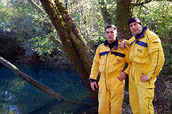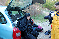 Ulaz u pećinu našli smo odmah. Sa površine medjutim, vukli smo našu arijanu. Brzo sma shvatili zasto kažu da je ovde vidljivost najčešće 1-2m. Mi smo izgleda imali sreće jer je vidljivost iznosila preko 5 m. Dno je prvo bilo prekriveno stenama a onda finim šljunkom koji se u slučaju dodira kao lavina kotrljao dublje u pećinu. Širina tunela je nekih 5-6m, a strop nam se sve vise približava. Nailazimo na ostatke nečije arijane koja je zatrpana šljunkom na 20m. Pravim vezište i menjamo gas. Nadam se da ćemo bez stage boce lakše proći restrikciju. Sad već ribriderom češem po plafonu. Vidim ispred sebe da se restrikcija još više sužava. Nerviram se jer smo raspravljali da ovde ponesemo side mount konfiguraciju. Iz razloga velike potrošnje gasa na otvoreni krug od toga smo odustali, kako bi sačuvali gasove za druge zarone. Ležim na dnu sa nosem bukvalno utopljenim u šljunak i kopam ispred sebe. Polako napredujem , ali osećam da se sve jače i jače zaglavljujem. Kratak pogled unapred, restrikcija je dugačka još par metara tako da odustajem. Dajem Miki znak lampom da se povlači. Orkećemo se i vidimo lavinu šljunka kako se spušta ka nama. Ovu pećinu treba roniti u proleće kada voda očisti restrikciju. Počinjemo sa izronom. Na naše iznenadjenje ispred nas prolazi jegulja osrednje veličine, a ubrzo za njom još jedna. Počinjemo malo bolje da se zagledamo ispod stena i otkrivamo veliki broj, dok na samom ulazu u pećinu ka nama nije zaplivala jedna impozantnih dimenzija. Jegulje u Ohridskom jezeru su naspram ove kao deca. Polako postaje svetlije i izranjamo. Kratak, ali poučan zaron. Skupljam arijanu i izlazimo iz vode. |