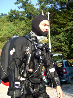 MIRKO "...pošto sam od ostalih dobio OK krenuo sam. Vidljvost je bila odlična. Jezero je sada izgledalo sasvim drugačije medjutim, već na dvadesetak metara nestaje dnevnog svetla i put mi osvetljava samo moja lampa. Vidim Vlatkovo svetlo iza sebe. Znam da je tu i da je sve ok. Počinjem da se spremam da odložim deko bocu. Stižem na dno na 32m skidam je i vezujem za arijanu. Osvetljavam Vlatku koji čini isto. Rutinsko OK i krećemo dalje. Laknulo mi je kad sam video da je permanentna linija koju smo u maju položili neoštećena. Prolazimo kroz restrikciju. Prijatno sam iznenadjen jer vrelo jedva radi. Polako pratim liniju i divim se sili prirode koja je u stenama izdubila neverovatne formacije. Osećam kako narkoza postaje sve jača. Dosta razgledanja sad se treba fokusirati. Pogled na timer, 58m. Nalazimo se u ogromnoj sobi. Vlatkovo svetlo mirno pored mene para mrak. Stižemo na kraj konopca. Dubina tačno 70m. Pogled u Vlatka. Nadao sam se da je dobro i da je raspoložen da nastavimo istraživanje... bar malo. Preti mi kažiprstom ali ispod maske vidim osmeh. Skidam veliku motalicu sa zadnjeg D-ringa. Vezujem se i krećemo dalje. Sad sam potpuno smiren i fokusiran. Pratim zid u kome naizgled nema prolaza. Približavam se peskovitom dnu. Sa desne strane otkrivam tunel i osećam kako mi puls opet skače. Polako smiri se i napred. Ulazim u tunel veličine 2x3m pravim vezište i krećem dalje. Tok vode je jako slab i vidljivost je odlična. Dno jako blago pada. Primećujem Vlatka koji daje znake da se vratimo, odgovaram potvrdno i nastavljam da nadjem pogodno vezište.Obmotavam arijanu oko kamena, vadim nož presecam je i motalicu predajem Vlatku. Imam malo muke u debelim rukavicama na 84m da vežem čvor. Ova aktivnost većini i na suvom teško polazi za rukom i moram vam reći da je na ovoj dubini pod narkozom to vrhunski napor za motoričke sposobnosti. Gledam na tajmer, vremena su OK. Polazimo nazad. Osećam da me sad pijanstvo sve više stiže. Olakšanje zbog uspešnog zarona i opuštanje sada nikako nisu poželjni. Koncentrišem se i na deep-stopovima sračunavam režim dekompresije. Od nekih 50m opet ulazimo u nultu vidljivost. Mlava nosi puno sedimenta koji se lako podiže. Držimo se za arijanu i prolazimo kritični deo. Izlazimo iz restrikcije, uzimamo boce sa deko gasovima. Predstoji nam rutinska dekompresija. Siguran sam da sam sve dobro sračunao, Vlatko je dobro, oprema i zalihe gasa Ok tako da sam mogao da se opustim i saberem utiske. Na 6m kratko mi se javlja Bane, baca pogled na timer. Siguran sam da sam čuo smeh pod vodom. Daje mi znak i izranja. Znao sam da i ovaj put vesti putuju brže od nas i da će radoznalci napolju saznati za naš zaron pre nego što izronimo. Tako je i bilo. Vlatko i ja izranjamo i vidimo ljude svuda oko vrela. Čeka nas aplauz i čestitke. Izlazimo umorni i srećni..."